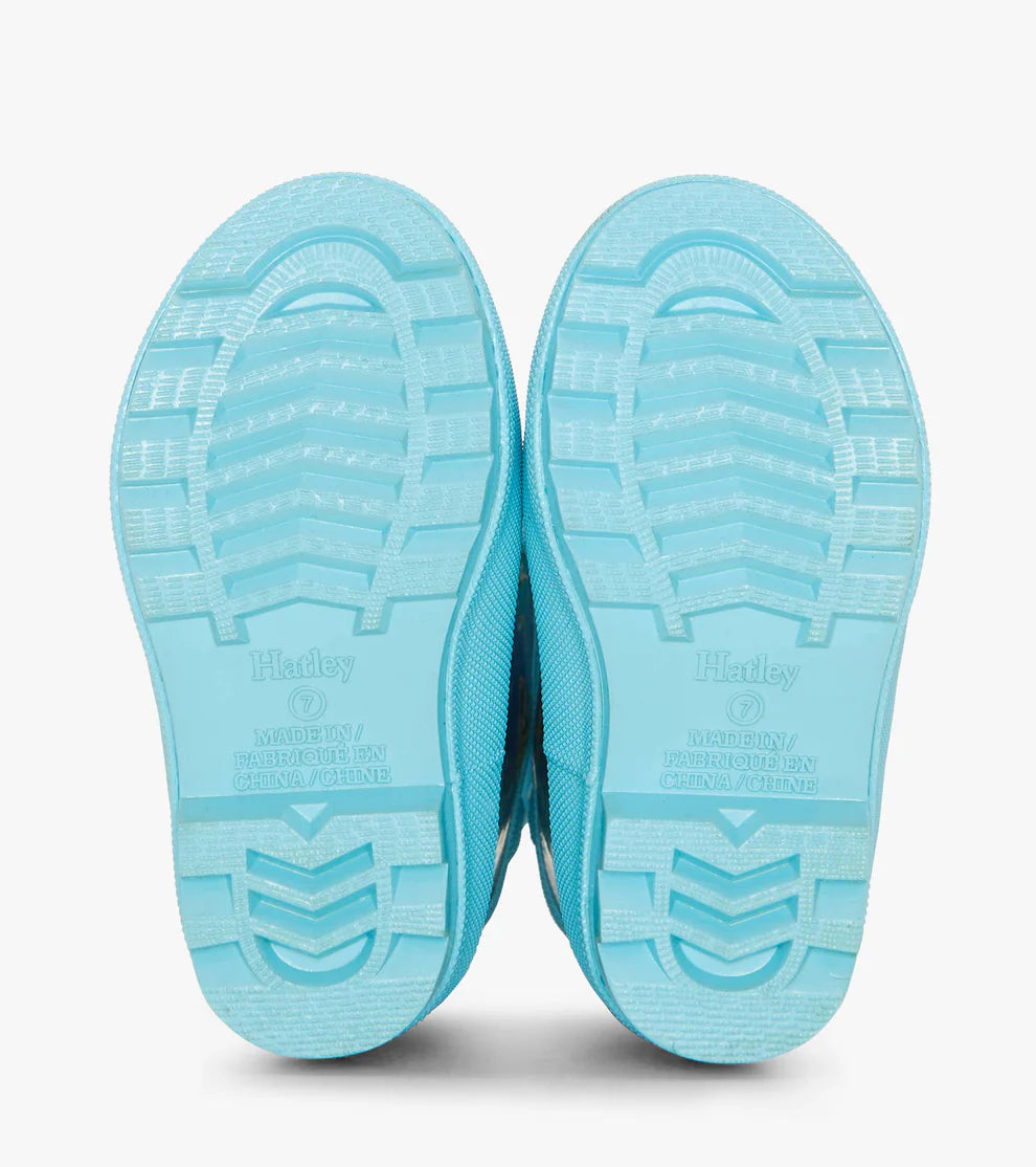The Boys Dino Roar Rain Boots turn grey Rainy days into adventures, crafted from waterproof vulcanised rubber with sturdy slip-resistant soles. A bright blue base is covered in playful dinosaurs in green, orange and aqua, finished with pale blue trims, striped accents and easy pull-on handles. Designed with comfort in mind, they include a removable insole and plenty of room for little feet to splash, stomp and explore in style. Perfect outfit for the dino lover.