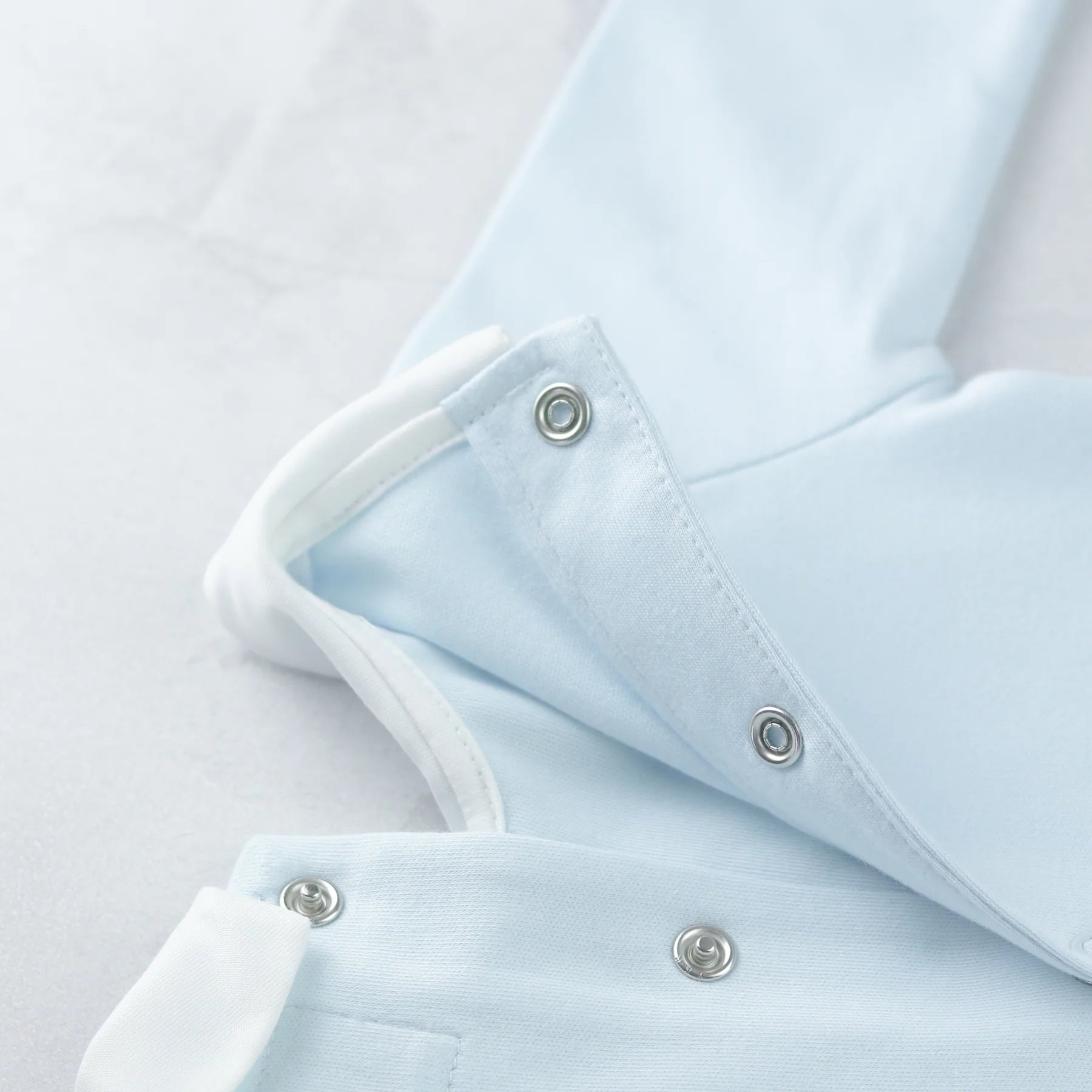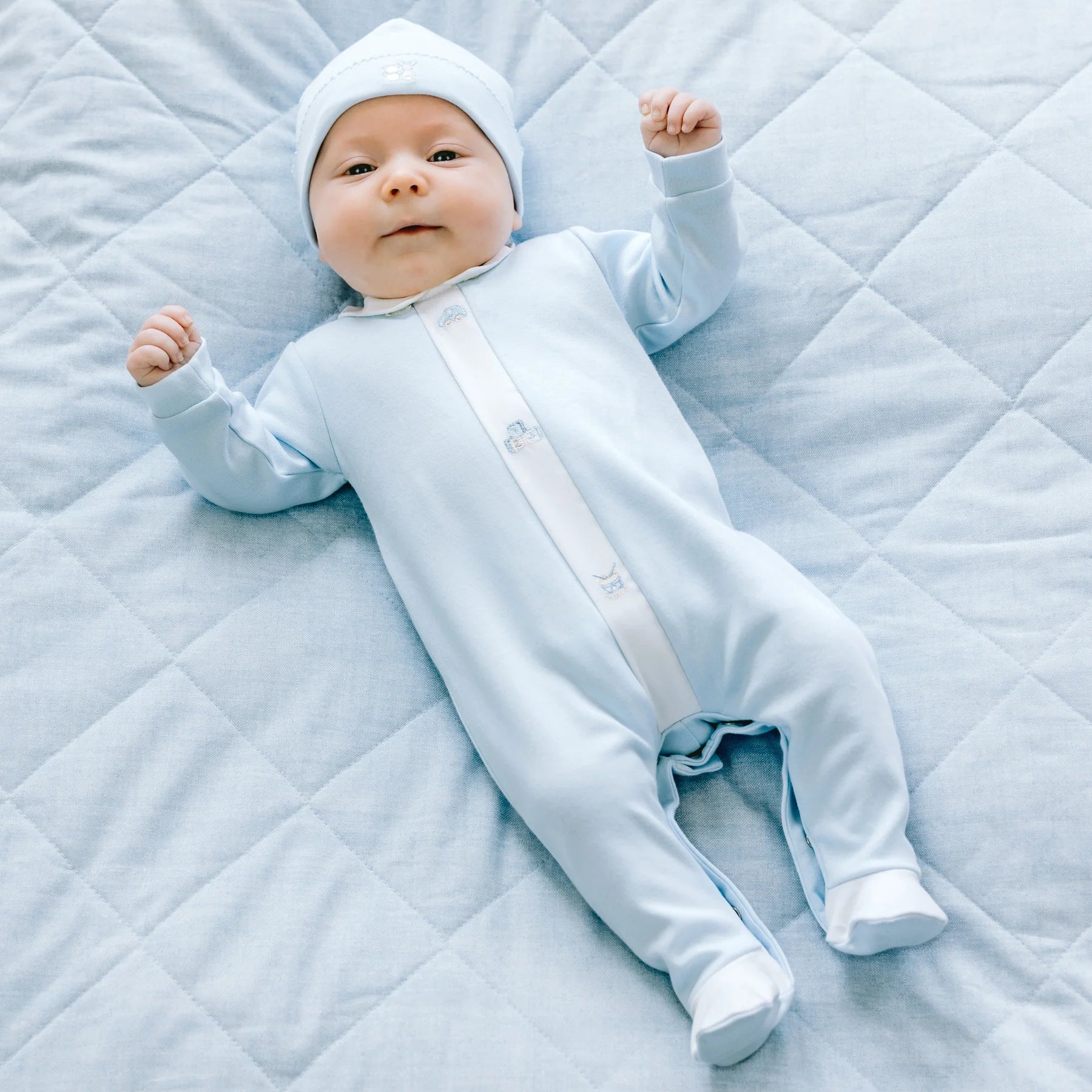The Emile et Rose Kent babygrow is a timeless piece for little boys, designed in pale blue with a crisp white collar and contrast trims. Adorned with delicate toy embroideries and paired with a matching pull-on hat, it brings charm to everyday wear and special moments alike. With soft cotton comfort and practical back poppers, it’s a thoughtful choice for new arrivals. A great gift idea for newborn to 1,3 & 6 months.