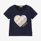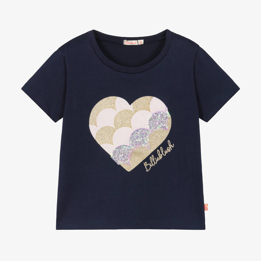 To complete the look is a cotton navy top with pink and gold sequin heart print on the front.