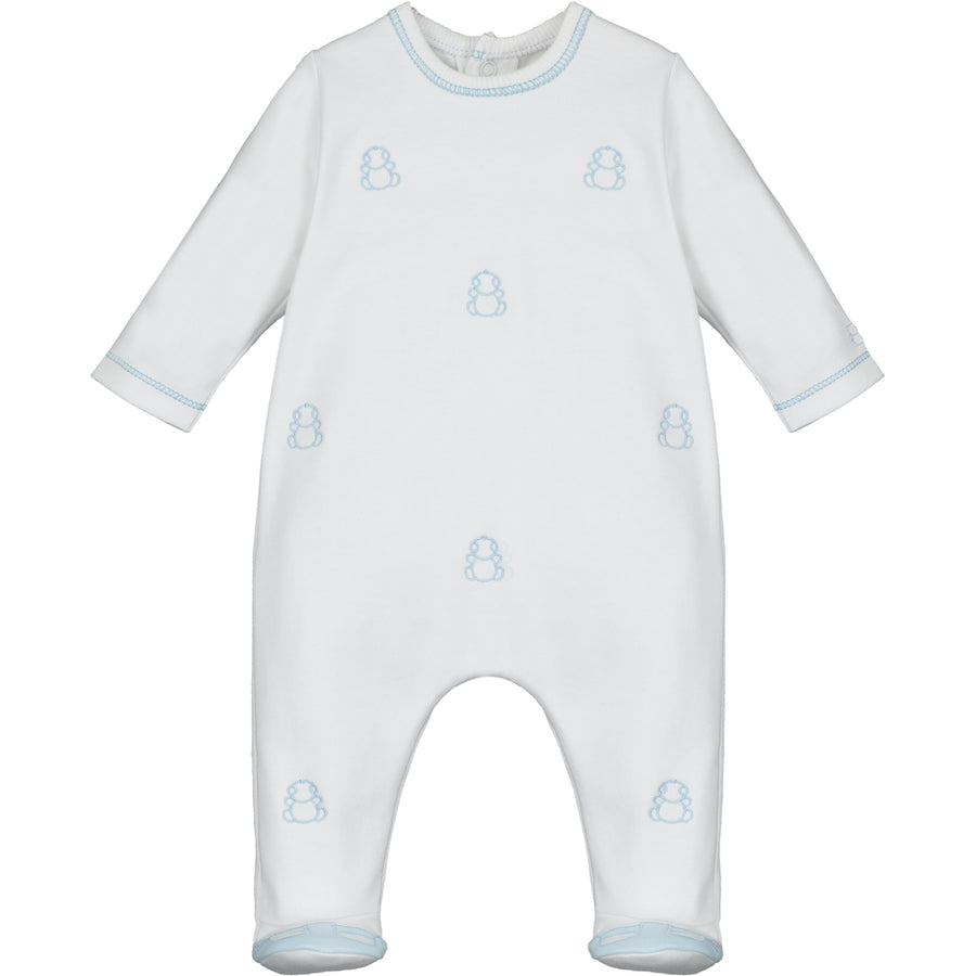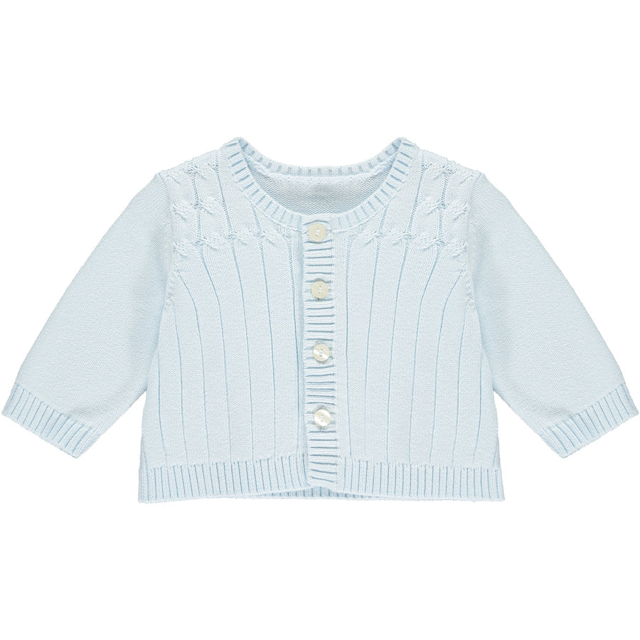 The pale blue cotton cardigan has cable knit detailing while the matching baby grow is all white with small blue bear silhouette embroideries.
