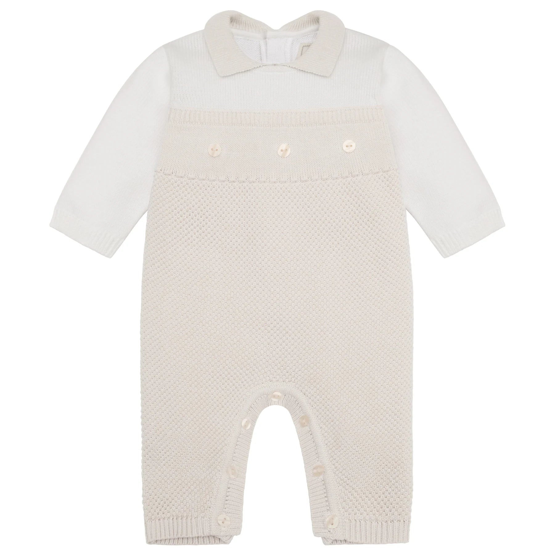 The Emile et Rose Kenzie Unisex Smart Knitted Babygrow brings timeless style with a cosy seasonal feel. Designed in soft stone with a contrasting white knit top and sleeves, it’s finished with a neat collar and pearlised buttons across the chest. A lovely choice for autumn walks, family gatherings, or special first outings, this all-in-one makes a thoughtful gift for baby boys and girls alike.