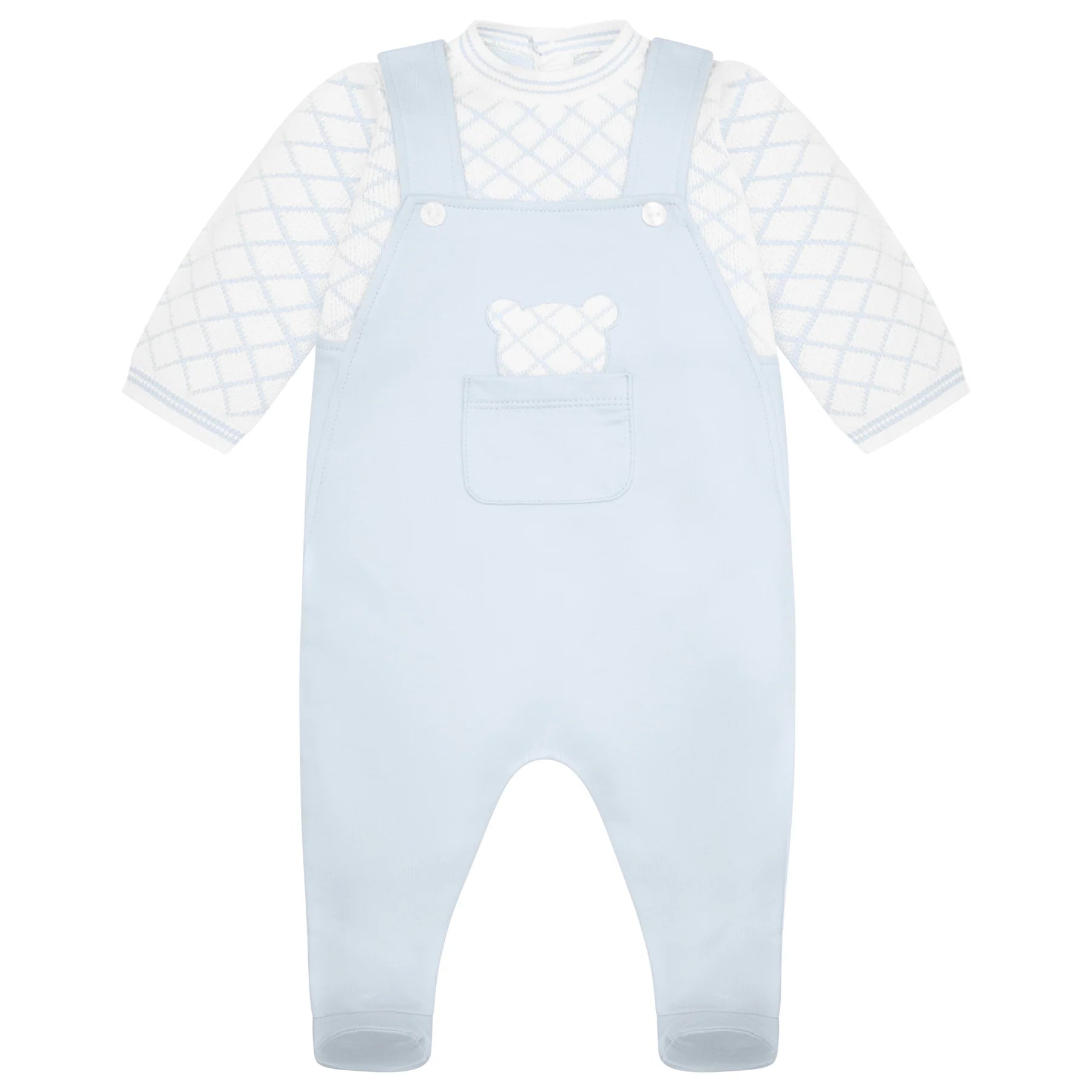 The Emile et Rose Kit Baby Boys Blue Teddy Dungaree Style Babygrow blends playful design with everyday comfort. Made to look like a dungaree-and-jumper set, this clever all-in-one features a soft checked knit top and pale blue jersey mock dungarees with feet. A sweet bear peeks out from the chest pocket, adding an extra touch of charm. Designed with a full back opening for easy changing, it’s a standout piece for little boys. A lovely gift idea for baby boys aged 3-6 months.