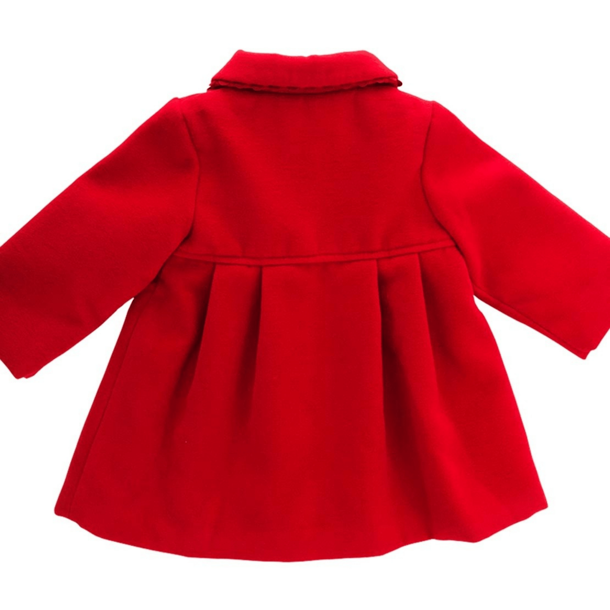 This classic red coat for girls by Sardon has a beautiful red bow detail on the front. This coat is really soft and comfortable to wear. It has four buttons down the front and adorable extra detail around the collar and the front of the coat. It also has beautiful traditional pleats on the front.
