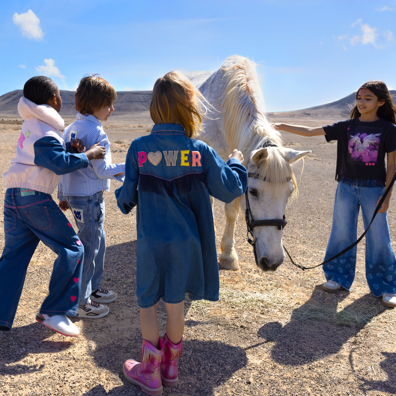 A playful twist on a classic bomber style, this Billieblush girls jacket blends cosy comfort with bold design. It features a soft faux fur body and collar in pastel pink, contrasted with cool denim sleeves for a laid-back look. On the back, a sparkling “LOVE” illustration with sequin details adds a signature Billieblush touch. Finished with a full zip closure and handy side pockets, this jacket is perfect for casual adventures with a hint of sparkle.
