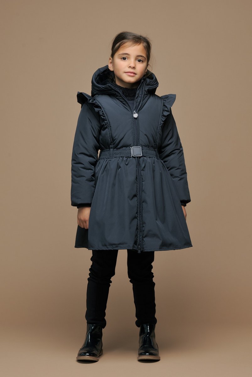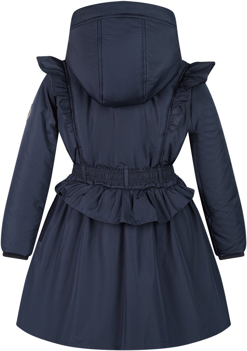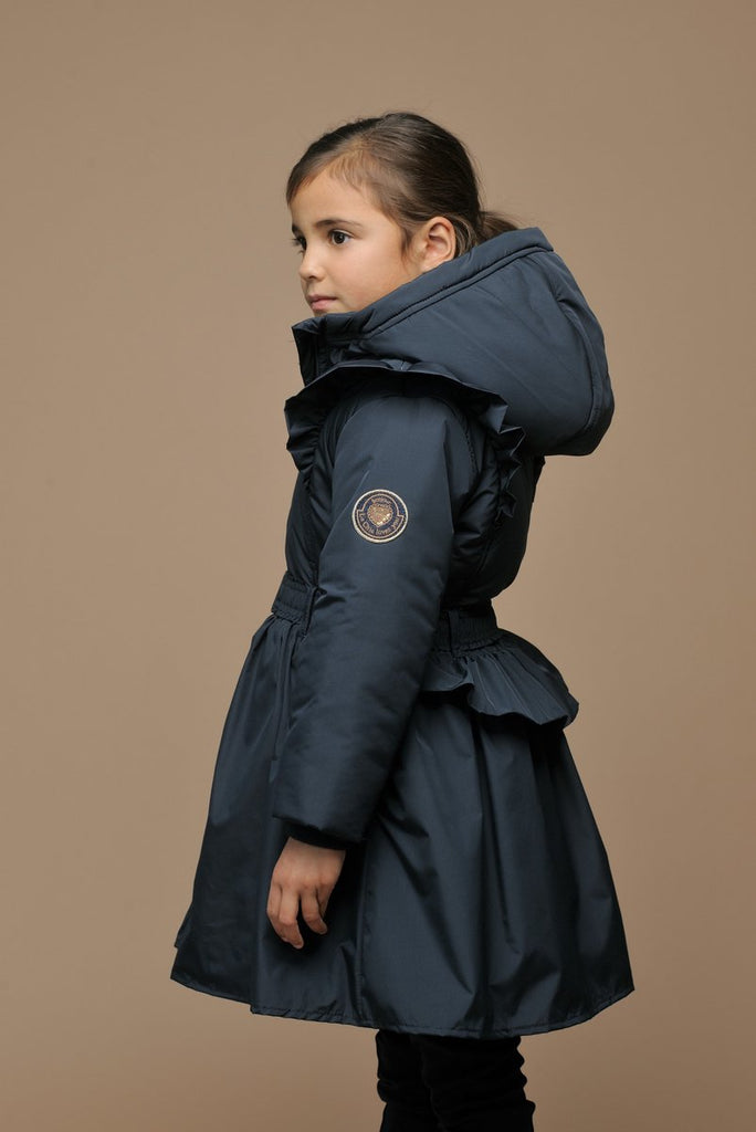 A timeless winter coat for girls in a deep navy, designed to blend warmth with elegance. The Le Chic Beth coat features a flattering belted waist and a softly flared hem, creating a pretty silhouette. Delicate ruffle details along the shoulders and waist add a signature Le Chic touch. A two-way zip allows for easy movement, while the faux fur lining — even inside the pockets — keeps it cosy. Finished with a lined hood and crafted from recycled materials, this coat is a smart, stylish winter essential.